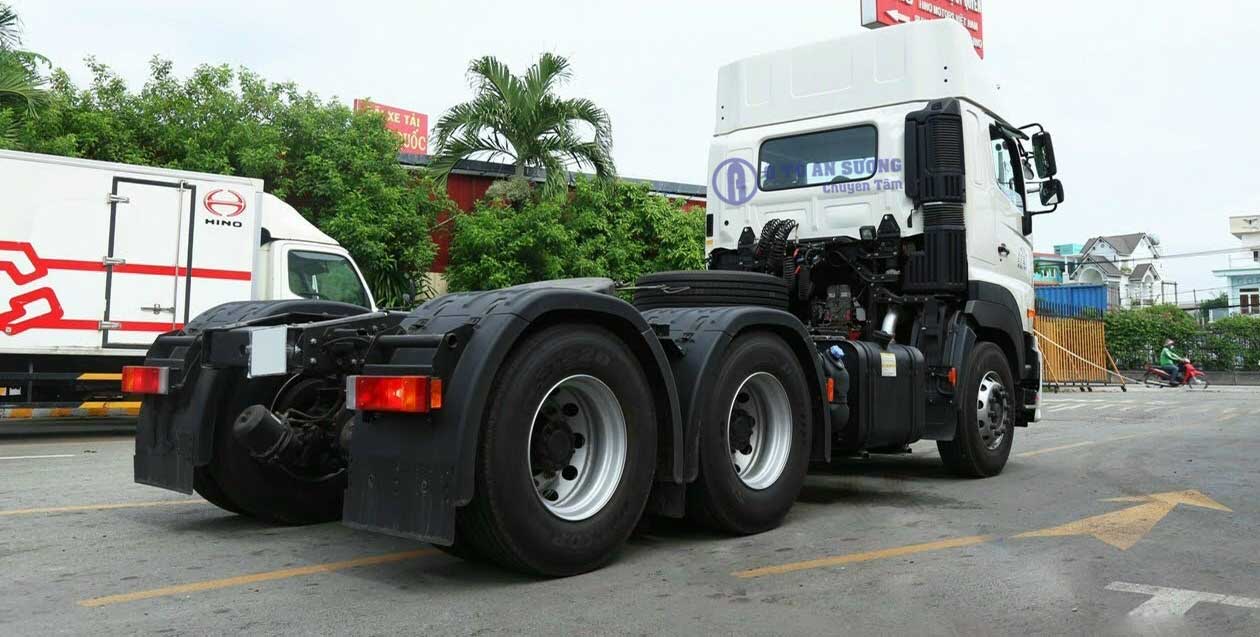 Đầu kéo Hino 420ps cầu chủ động sau có tỷ số truyền 4.5. Hệ thống treo trước có hai lá nhíp hoạt động theo nguyên lý phụ thuộc. Với nguyên lý hoạt động như vậy có thể khiến cho xe chịu tải tốt hơn, nhưng điểm bất lợi của nó là khiến người ngồi trong xe cảm giác không được êm ái cho lắm, đặc biệt là khi xe đi qua các đoạn đường xấu. Bù lại được điều đó thì Hino 420 mã lực cũng được trang bị thêm 2 thanh giảm xóc thủy lực giúp giảm sóc hơn cho xe.
