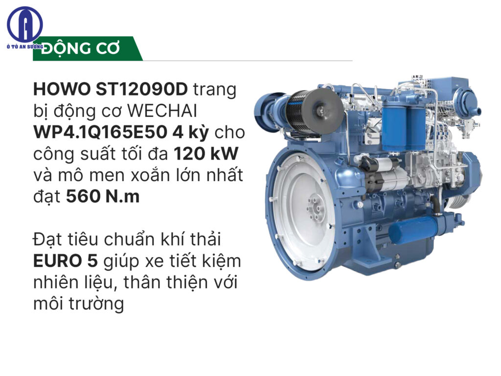 Trái tim của xe ben TMT 8T6 ST12090D thùng 7 khối được sử dụng khối động cơ Weichai WP4.1Q165E50. Có thể tích làm việc 4.088L, sản sinh công suất 120 mã lực tại vòng tua máy 2600 vòng/ phút. Xe sử dụng động cơ Diesel 4 kỳ, 4 xi lanh thẳng hàng, làm mát bằng nước, tăng áp, không chỉ giúp xe vận hành mạnh mẽ mà còn tiết kiệm nhiên liệu động cơ đạt chuẩn Euro 5, cải tiến.