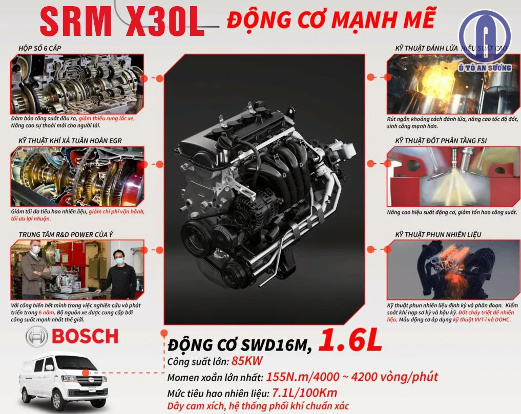 Điểm mạnh của xe tải SRM X30L 2 chỗ là khối động cơ SWD16M với công nghệ Đức tiên tiến, dung tích xy lanh 1.6L loại động cơ không chì, 4 kỳ, 4 xy lanh thẳng hàng, làm mát bằng nước, đáp ứng chuẩn khí thải Euro 5 thân thiện với môi trường.