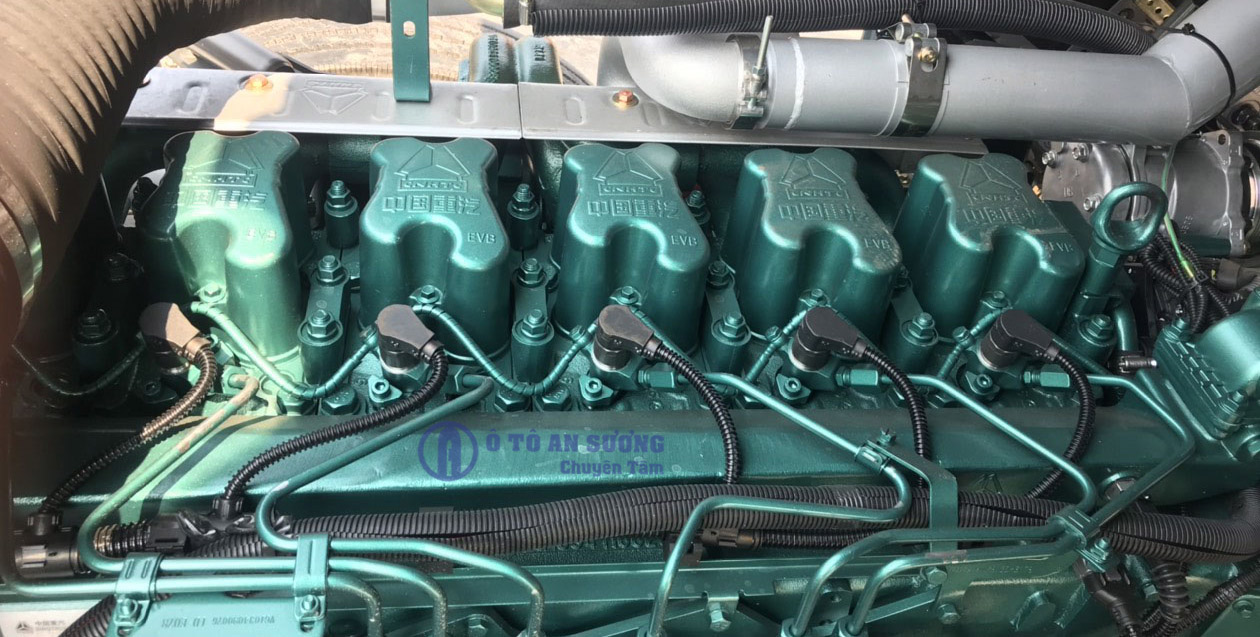 Xe tải Howo Max 4 chân thùng dài 9m7 được trang bị động cơ D10.38-50 do Sinotruck sản xuất. Tiêu chuẩn khí thải Euro 5, thân thiện với môi trường. Dung tích xy lanh 10.6L. Sản sinh công suất cực đạt đạt 380 mã lực tại vòng tua máy 2.200 vòng/phút. Mô men xoắn cực đại đạt 1.560N.m tại vòng tua máy từ 1.200-1.6000 vòng/phút. Mô men xoắn cao ở vòng tua máy thấp giúp Howo Max 4 chân đạt được sức kéo vượt trội, với mức tiêu hao nhiên liệu khiêm tốn.